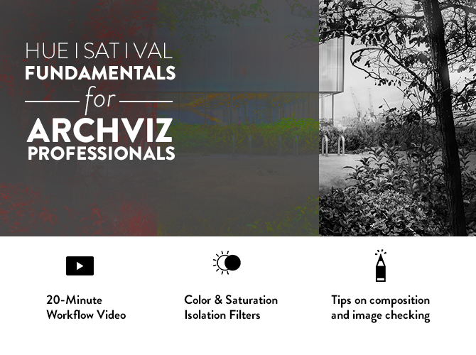 Hue : isolating hue in your image will help you finetuning your colours, compare them precisely to archviz precedents you have, and will also help you tweaking the shadows of your image properly when integrating cutouts or compositing