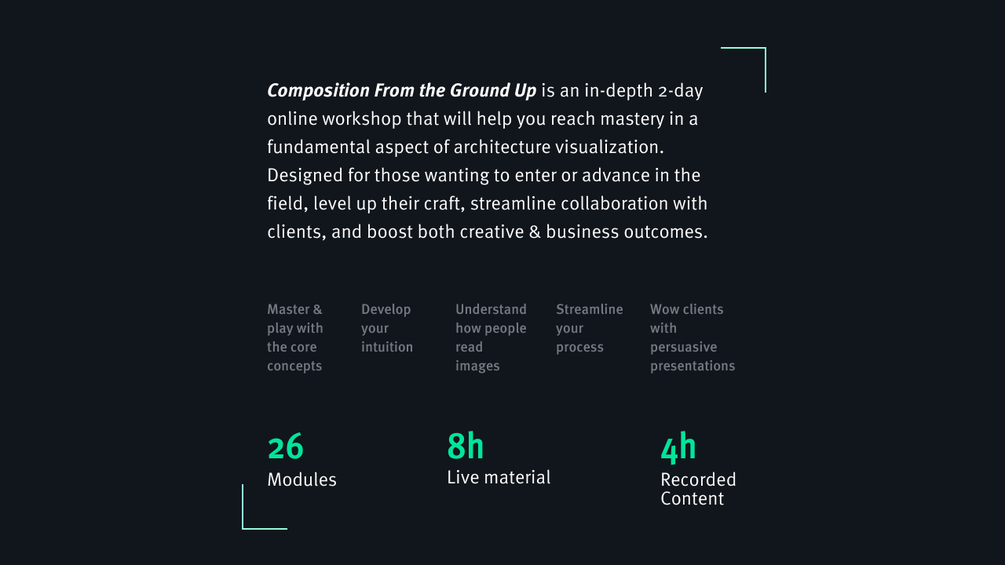 Composition From the Ground Up is an in-depth 2-day online workshop that will help you reach mastery in a fundamental aspect of architecture visualization. Designed for those wanting to enter or advance in the field, level up their craft, streamline collaboration with clients, and boost both creative & business outcomes.